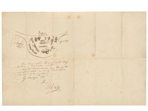 Small stain at upper right margin. Pin hole at upper margin. Overall light browning and soiling. Split approx. 25mm at outer margin of horizontal fold.