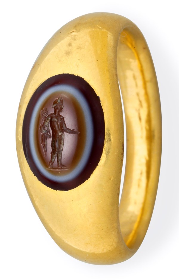In good condition, intact and wearable. With minor abrasions to the gold and stone. Minor dents to the gold overall.