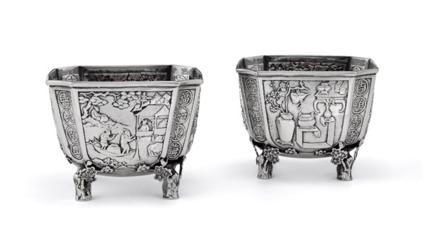most feet very slightly pushed up into base of bowls, one wobbles slightly on flat surface, some wear to high spots of chased decoration throughout, some scattered salt stains, otherwise good condition