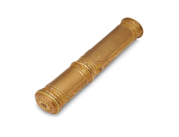 Overall with some minor scratches consistent with age and use, marks inside cover slightly worn, some wear to the gold decoration particularly to the high points and some tiny areas of loss to rim of cover, one tiny rough area to body where it joins the flange, generally good condition.