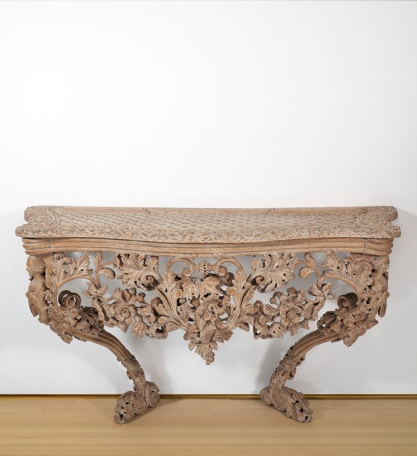 The top, carved with flowering branches, over pierced foliate frieze, legs headed by terms, with later glass top