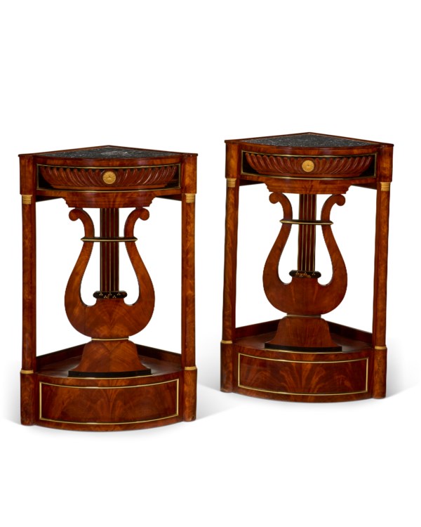 Scattered age and construction cracks. With general overall marks, nicks, surface scratches, tiny losses and repairs consistent with age and use. The veneers with scattered fraying, lifting, and minor cracks with minor areas of losses and signs of infill and restorations. The ebony with some fine cracks, as expected. Some minor areas of debris accumulation in recessed areas. One marble top with a well-executed repair. The ormolu with some minor surface scratches, casting flaws, verdigris and rubbing, as to be expected.