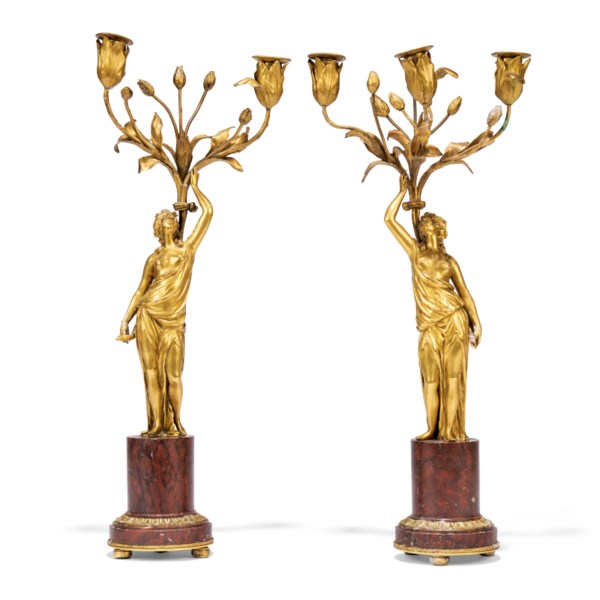 In country house condition. The whole covered in candle wax residue and would benefit from a clean. The ormolu with the scratches and areas of tarnish as expected with age and use. The marble base with several chips and scratches and a repaired break with both candelabra sporting noticeable cracks and losses to the lower portion of the socle.