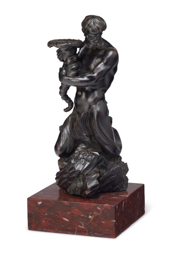 Overall good condition. The bronze with some rubbing and minor surface wear as expected, especially at high points. Scattered casting imperfections, largely to the base. Some minor scratches to the surface. Later drilled hole to the lip of cornucopia. Later drilled holes to the underside of the base to attached to marble. The marble with natural inclusions and scratches to top commensurate with use.