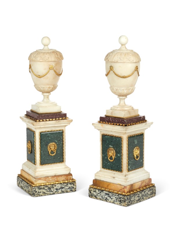 Overall with some minor chips and losses to extremities, including 'nibbling' to edges, as to be expected. Each urn reattached at the socle (one with discoloration); the ball finials reattached and possibly replaced. Three of the porfido verde panels with hairline cracks. Presents well and ready to place.