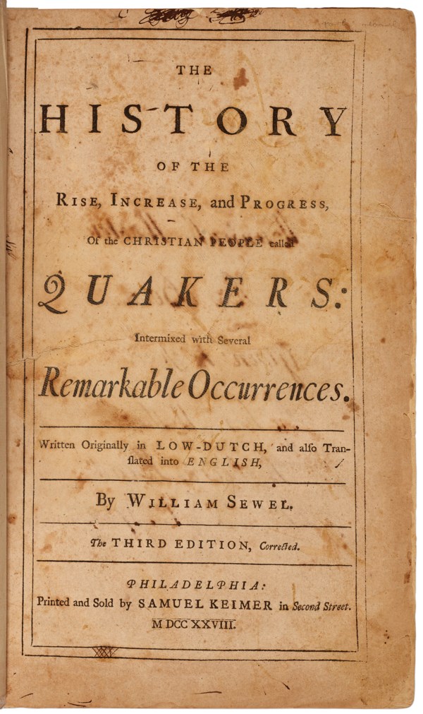 First American edition of Sewel's history of the Quakers, partially printed by Benjamin Franklin—the first project of his new press. First published in Amsterdam in the Dutch language in 1717, an English translation was soon made for the author. Andrew Bradford proposed an American edition in 1723, underwritten by Philadelphia Quakers. There was some confusion, and the Overseers ended up hiring Samuel Keimer to do the printing, while at the same time, Bradford sent out to London for the edition. There were hurt feelings all around. What ended up being the second overall London edition came out in 1725. The present edition is the one commissioned from Keimer, who finished only with the assistance of Ben Franklin, who had previously been Keimer's foreman. Franklin relates the story in his autobiography. This copy was owned by many generations of the Hooton family (perhaps some relation of Quaker preacher Elizabeth Hooton?), with series of gift inscriptions and notes, mostly between women, beginning in 1750 and ending with Francis Barton Gummere in 1936. Miller 1.