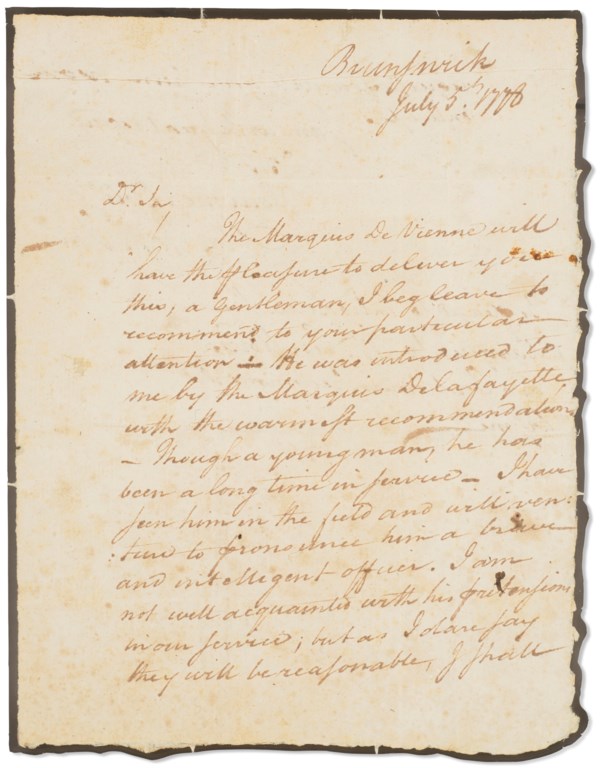 HAMILTON, Alexander (1757-1804). Autograph letter signed ("Alex Hamilton") [to Elias Boudinot], [New] Brunswick, N.J., 5 July 1778. Recommending Louis-Pierre, Marquis de Vienne, a French officer who had been recommended by Lafayette.