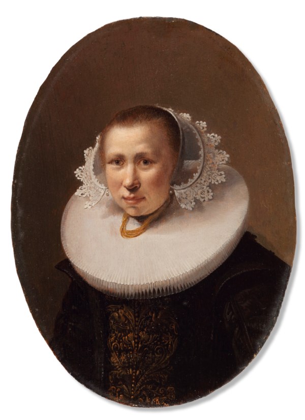 Examination under UV light confirm the aforementioned retouchings in addition to a few pinpoint retouchings in her face and to her left eyebrow and to the blacks of her costume. Discreet retouchings can also be seen in her white collar. The larger part of her necklace is strengthened.