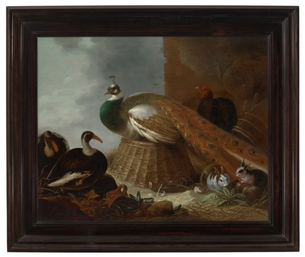 This panel is comprised of three horizontally oriented boards with horizontal wood grain. The boards measure 8 1/4, 10 3/4 and 4 3/4 inches in height from top to bottom. The joins have separated slightly over time. Overall the panel is in stable condition. The paint layer is clean under a clear varnish, which saturates the colors nicely. There are some pin point losses along the panel joins and associated restorations. Further restorations to the sky and to small losses in the peacock's tail at right are visible in natural light. Inspection under ultraviolet light confirmed the aforementioned restorations and reveals additional feathered strokes of retouching to the background at right. A complete inspection under ultraviolet light is hindered by an uneven opaque varnish. The painting presents well and should be hung in its present state. Pinpoint losses along the joins could be repaired to taste. The painting is offered in a dark wood Dutch style frame.