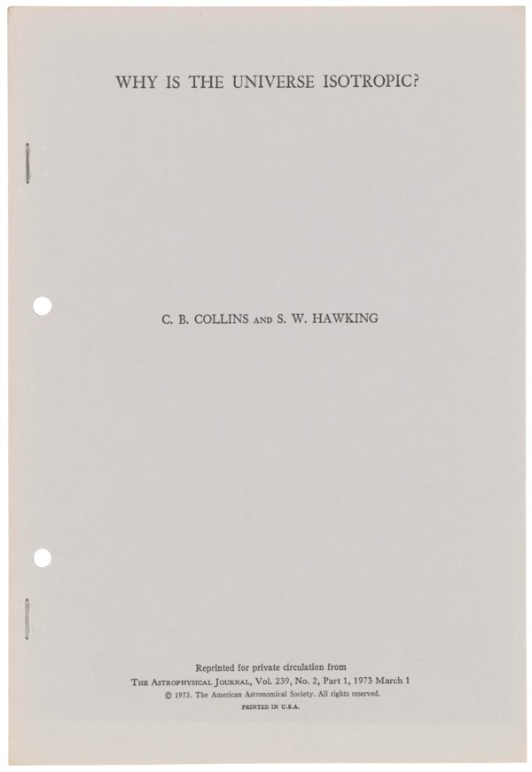 ‘Why is the Universe Isotropic?’ Offprint from: The Astrophysical Journal, Vol. 239, No. 2, Part 1, pp.317-334. [Chicago: University of Chicago Press for the American Astronomical Society,] 1973. Provenance: the estate of the late Professor Stephen Hawking.