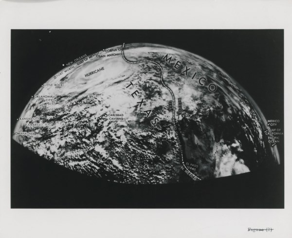 “The spiral cloud pattern in the upper left center was produced by a tropical disturbance that had moved over Texas from the Gulf of Mexico. Decreasing in intensity, it did not disturb the surface winds, but maintained a tight cyclonic circulation in the upper atmosphere. At a glance, this picture documented a flood-producing circulation that was undetected by routine means after moving over Texas. Photography from rockets stimulated the meteorological satellite program, but no previous picture had been as dramatic as this, nor as convincing that satellite surveillance of hurricanes was feasible. Here was the first demonstration that storms could be detected by ultra-high level photographs (since borne out by thousands of satellite pictures). This mosaic was constructed by Otto Berg, who was in charge of the Naval Research Laboratory’s rocket photography” remembered Lester Hubert, of the National Environmental Satellite Center (Cortright, p. 4).